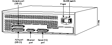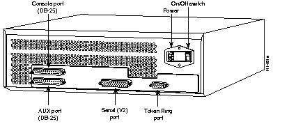 When viewed from the rear of the chassis, the power connector and switch appear on the right side. The ports for the router console, auxiliary (AUX), LAN (Token Ring or Ethernet), and serial line appear to the left of the power connector and switch. The configuration depends on which model you purchase. Refer to Figures 2-2 and 2-3 for rear views of the router.