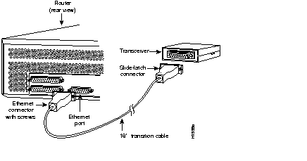 Step 1 Attach the Ethernet AUI transition cable with screws to the 15-pin D-type router connector labeled Ethernet. (See Figure 3-2.)