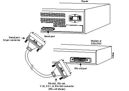 The serial connector on the router end of the cable is the same regardless of the type of serial interface (V.35, RS-232, RS-449, EIA-530, or X.21) on the modem or CSU/DSU. Use the specific serial transition cable for your modem or CSU/DSU connector type.